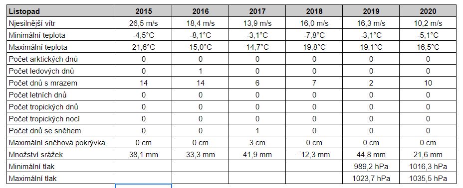 Listopad za námi, poslední měsíc s měřením ručního odpisu z digitální stanice umístěné metr nad zemí, na kousku zahrady uzavřeného dvora, na dvojité severní straně dřevěné kůlny s nízkým sklonem střechy, zastíněnou od V i Z budovami. Tedy v místě, kde slunce nikdy nesvítilo, ale díky pozici dvora v "ďolíku", dochází při bezvětří k přehřívání a akumulaci tepla a to i nad travnatým povrchem. To je nyní minulost, nové čidlo je umístěné dál od uzavřeného dvora, na vyvýšené části zahrady, daleko od budov a cest, a správně 2 m nad zemí. Rozdíly v naměřených teplotách o proti pozici původního čidla tam jsou každý den.